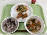 献立 ・赤飯 ・とりのからあげ ・野菜のごまあえ ・すまし汁 ・ジョア