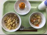 献立 そぼろご飯 塩肉じゃが 果物 牛乳 こんにゃく(群馬) ゆず果汁(愛媛)...