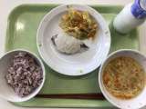 献立 黒米ごはん 鰆の桜蒸し きゃべつのごまサラダ かき玉汁 牛乳 ☆鰆の桜蒸...