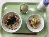 献立 わかめうどん 糸寒天サラダ よもぎ蒸しパン 牛乳 卵(群馬) 鶏肉(岩手...