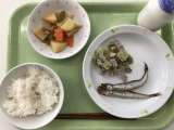 献立 ご飯 焼きししゃも 野菜のゆかり和え 春野菜の煮物 牛乳 きゃべつ(愛知...