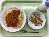 献立 ミートソーススパゲティ かむかむじゃこサラダ 牛乳 ぶた肉(埼玉) ベー...