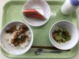献立 しいらの揚げ煮丼 きゅうりと茎わかめのサラダ 小玉すいか 牛乳 米(山形...