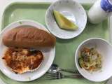献立 米粉パン かじきのセサミやき ミニトマト ABCスープ 牛乳 めかじき(...