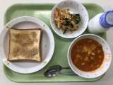 献立 セサミトースト ポークビーンズ 油揚げのサラダ 牛乳 豚肉(埼玉) にん...