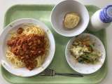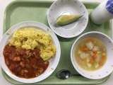 献立 ココアパン ミートオムレツ スパゲティソテー 野菜スープ 牛乳 ベーコン...