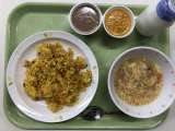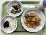 献立 豆カレー きゅうりの南蛮漬け 果物 牛乳 米(山形) 鶏肉(岩手) にん...