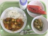 献立 夏野菜のカレー 野菜のごまサラダ 小玉すいか 牛乳 にんにく(青森) ...