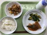 献立 ごはん しいらのおろしだれ 大豆とじゃが芋の甘辛 ピリ辛きゅうり 牛乳 ...
