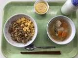 献立 大豆とごぼうのそぼろご飯 冬瓜のスープ 黄色い桃のゼリー 牛乳 米(山形...