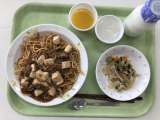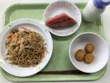 献立 マーボー焼きそば こんにゃくサラダ えらんで♪ゼリー 牛乳 こまつな(江...