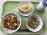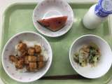献立 かじきの揚げ煮丼 みそドレサラダ 小玉すいか 牛乳 こまつな(江戸川) ...