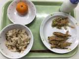 献立 鶏飯 きびなごのフリッター ごぼうサラダ 冷凍みかん 牛乳 きびなご(鹿...