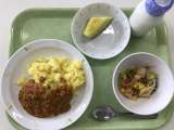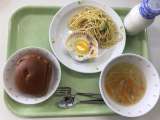 献立 ココアパン めだまココット スパゲティソテー せんぎりやさいのスープ 牛乳...