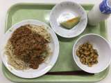 献立 ミートソーススパゲティ ベイクドポテト もやしサラダ 牛乳 にんにく(青...
