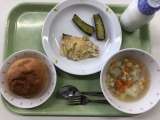 献立 米粉パン 鯖のアイオリソース ABCスープ あじつけきゅうり 牛乳 玉ね...
