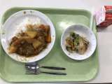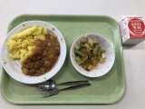 【献立】 キーマカレー こんにゃくサラダ 牛乳 【材料】 豚肉(茨城) 米(山...