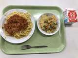 【献立】 ミートソーススパゲティ 和風パリパリサラダ 牛乳 【材料】 豚肉(茨...