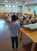 朝食を食べて、引き続き閉園式を行います。楽しい思い出をつくることができた宿舎の方...