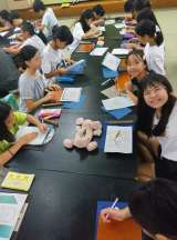 夕食がおわり、夜のアクティビティである日光彫です。下絵を準備し、独特の彫刻刀で彫...