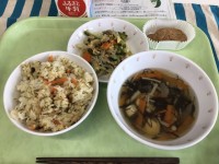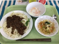 郷土料理献立(岩手県)盛岡風じゃじゃ麺牛乳糸寒天と野菜のあえものピーチヨーグルト...