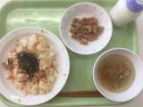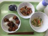 献立 かつおの揚げ煮丼 野菜のからし醤油和え 五目豆 プルーン 牛乳 米(秋田...