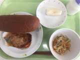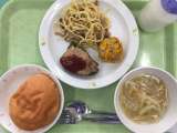 献立 米粉パン ピーマンの肉詰め とうもろこしの肉団子 スパゲティソテー 千切り...