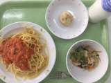 献立 ツナのトマトクリームスパゲティ 米粉のポンデケージョ みそドレサラダ 牛乳...