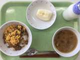 献立 大豆とごぼうのそぼろご飯 さつま汁 りんご 牛乳 鶏肉(岩手) 豚肉(埼...