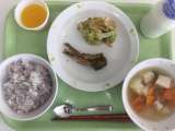 献立 ゆかりご飯 にぎすの磯部あげ 野菜のおかか和え 冬瓜のスープ みかんゼリー...
