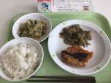献立 麦ごはん 牛乳 魚のフライ(中濃ソース) 野菜の海苔あえ 茎わかめのきんぴ...