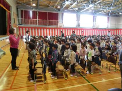 上の学年の児童を見習って、タイミングを合わせて立ったり座ったりと頑張っていました。