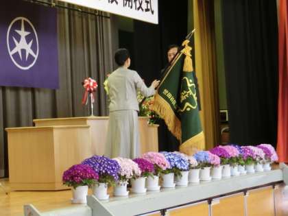 まずは世田谷区長から本校校長へ校旗が授与され、お祝いの言葉を頂戴いたしました。