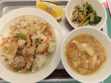 献立 たけのこごはん のっぺい汁 ごまあえ 果物(河内晩柑) 牛乳
