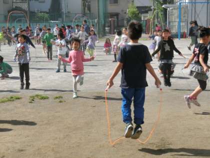 今朝は高学年は長縄、中学年は短縄、低学年はストレッチや体操を楽しみました。