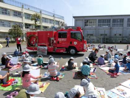 今日は1・2年生とくるみ学級のみんなが、消防車の写生に挑戦です。