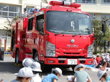 校庭にやってきた真っ赤な消防車は、なんと新車だとか。まぶしいほどにピッカピカです!!