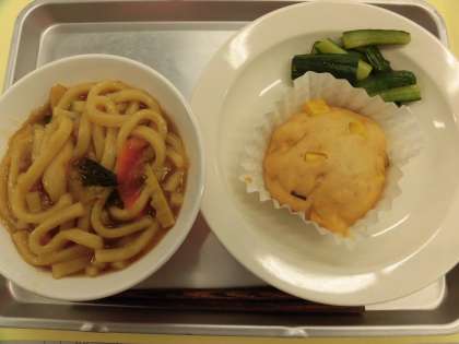 献立 カレー南蛮 きなこ蒸しパン きゅうりの甘酢漬け 牛乳