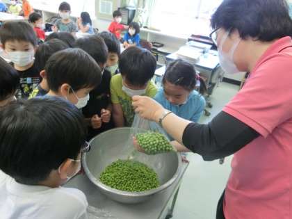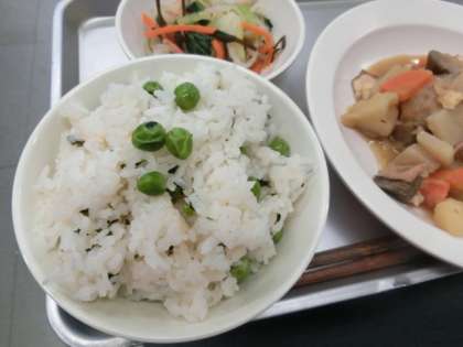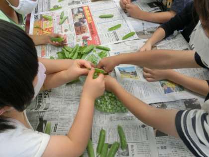 この日むいたグリンピースはみんなの給食に提供され、おいしくいただきました。