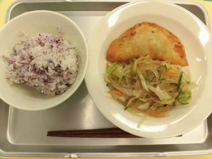 献立 ゆかりごはん ジャンボぎょうざ 春雨サラダ 牛乳