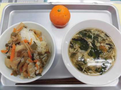 献立 山菜おこわ ひじきスープ 果物(冷凍みかん) 牛乳