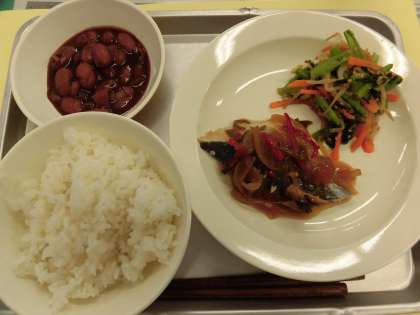 献立 ごはん さわらの甘酢あんかけ 野菜のごまだれあえ 煮豆 牛乳