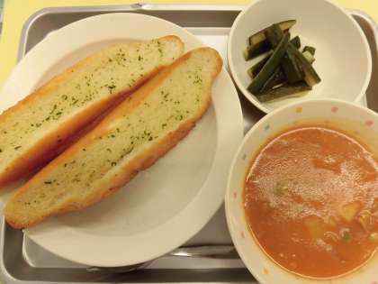 献立 ガーリックトースト トマトシチュー きゅうりのピクルス 牛乳