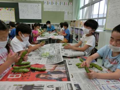 1時間目に1年生とくるみ学級のみんなは、生活科の授業で全校児童分のそら豆のサヤをむきました。