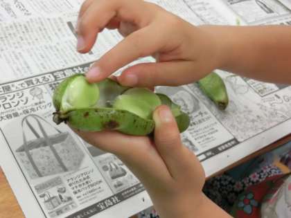 栄養士さんの話を聞いた後、大きなそら豆のさやをにぎって挑戦です。