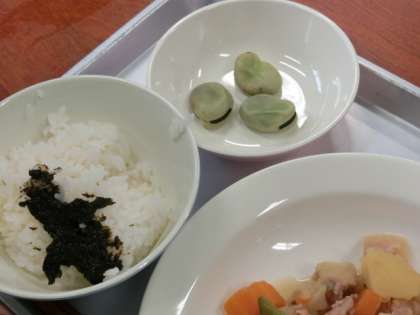 そら豆は今が旬です。みんながむいてくれたそら豆は、塩ゆでになって今日の給食になりました。