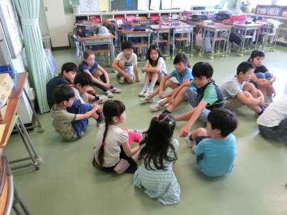 今朝ははじめてのなかよし班遊びです。まだぎこちないですが、6年生がリーダーとなって、下級生たちを一所懸命にまとめていました。