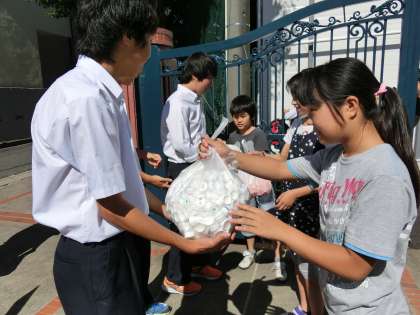 あいさつ運動の後、北沢中のエコキャップ運動に協力するため、環境委員会の児童がこれまでためてきたボトルキャップを中学生に手渡しました。