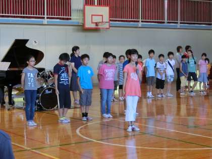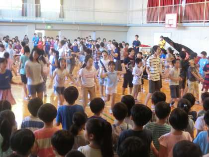 途中からは6年生の有志が前に出て、ダンスを交えてさらに元気に歌いました。他の学年の子たちも、自分の場所でノリノリです。