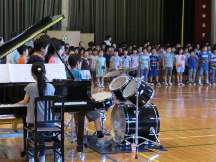 今朝は音楽委員会のみんなの演奏で、「勇気100%」を歌いました。